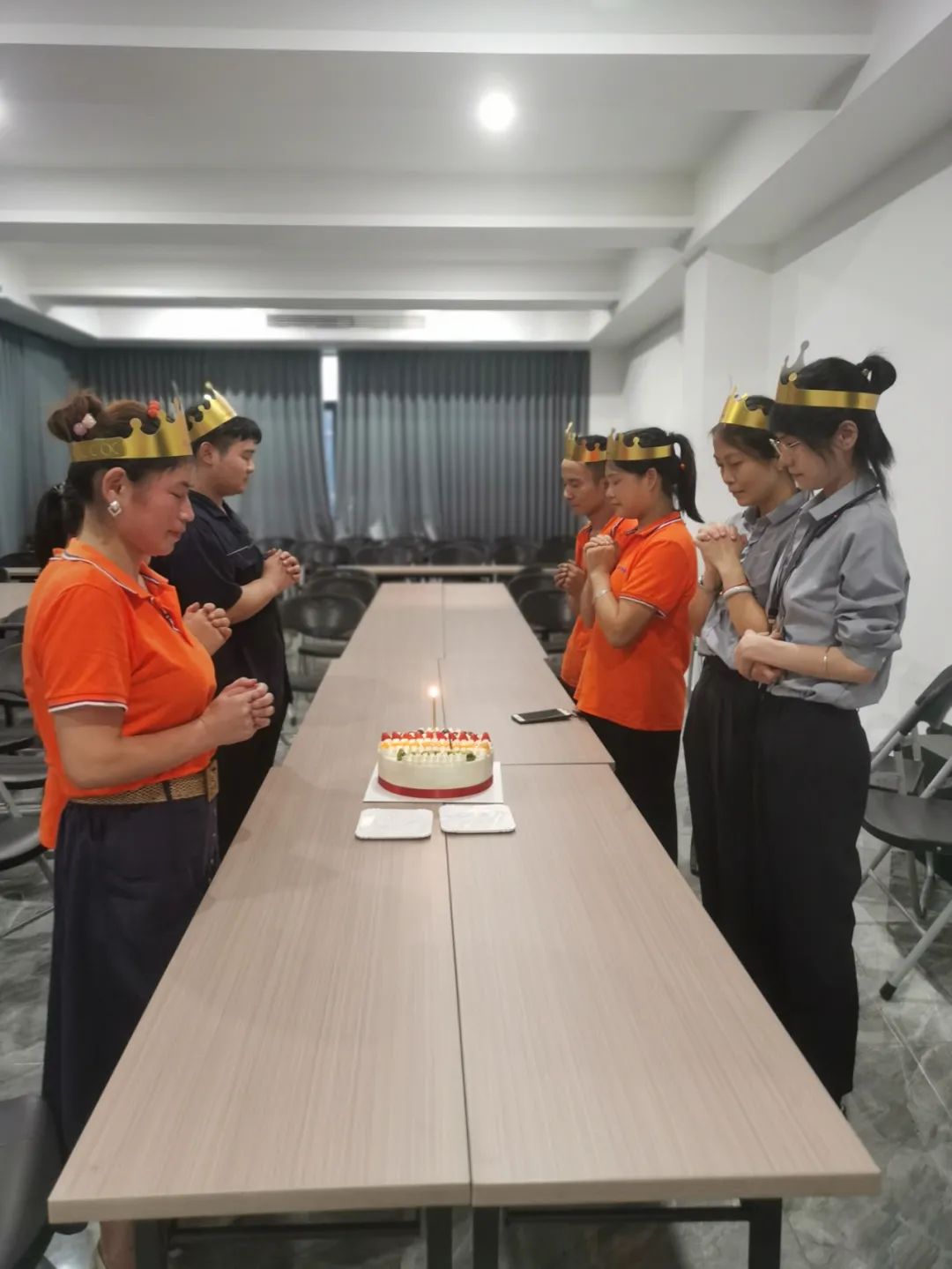 公司為過生日的伙伴們準(zhǔn)備了蛋糕。來,點(diǎn)上蠟燭,我們閉上眼,一起來許一個愿望吧!